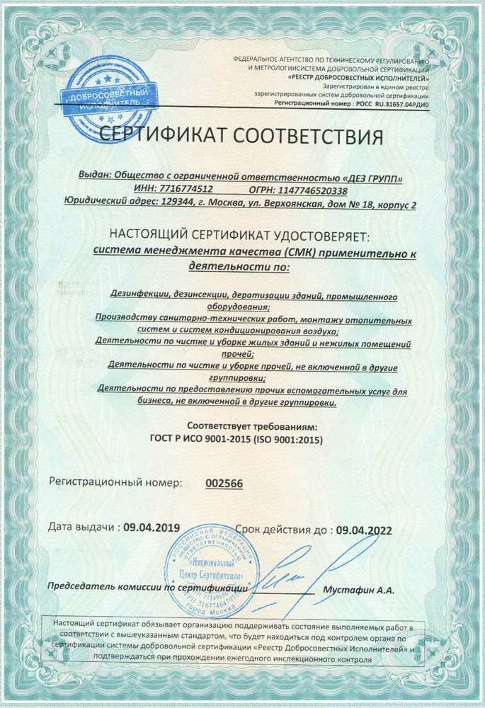 Компания «Дез Групп» уже на протяжении шести лет работает в сфере оказания услуг по устранению разных вредителей и паразитов, насекомых, грызунов и патогенных бактерий. Мы состоим на учете в Роспотребнадзоре, как официальная СЭС, действующая на территории Москвы и Московской области.