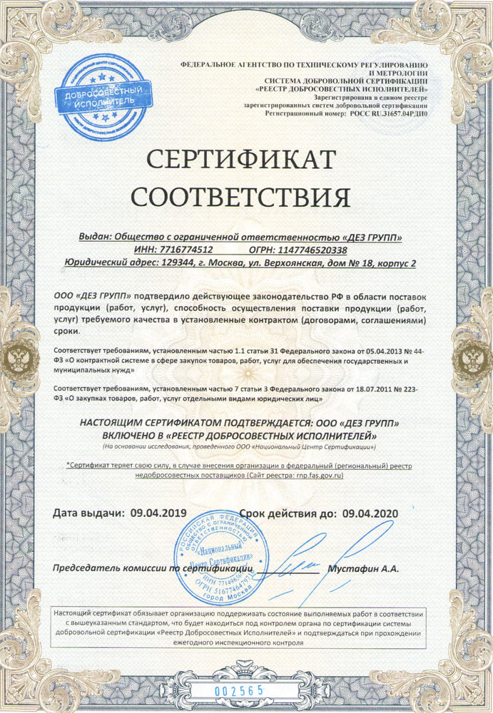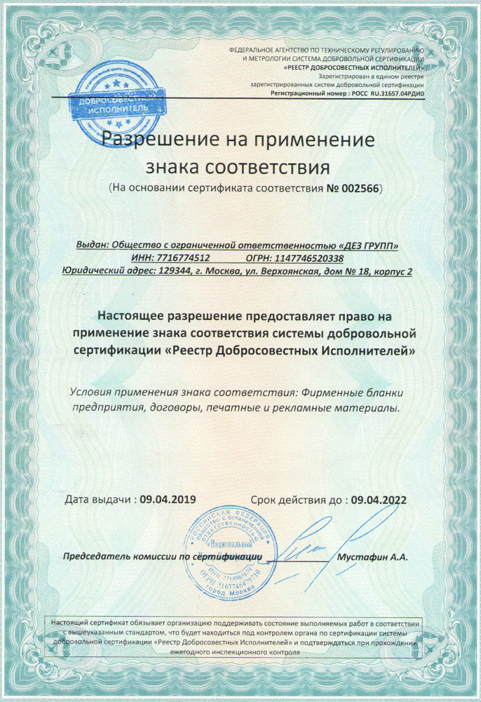 Отправляя свою заявку в Общество с ограниченной ответственностью «ДЕЗ ГРУПП» (ООО «ДЕЗ ГРУПП») я подтверждаю, что в соответствии с п. 9 Федерального закона от 27.07.2006г. № 152-ФЗ «О персональных данных», действую свободно, своей волей и в своем интересе. Настоящим даю согласие ООО «ДЕЗ ГРУПП» (ИНН 7716774512), находящемуся по адресу: 129344, г. Москва, ул. Верхоянская, д.18, корп.2 на обработку с использованием средств автоматизации или без использования таких средств моих персональных данных включая без ограничения сбор, запись, систематизацию, накопление, хранение, уточнение (обновление, изменение), извлечение, использование, передачу (распространение, предоставление, доступ), обезличивание, блокирование, удаление, уничтожение персональных данных, с целью получения консультации по услугам ООО «ДЕЗ ГРУПП».